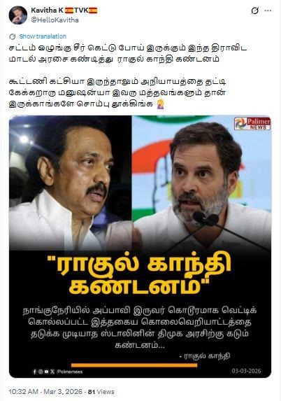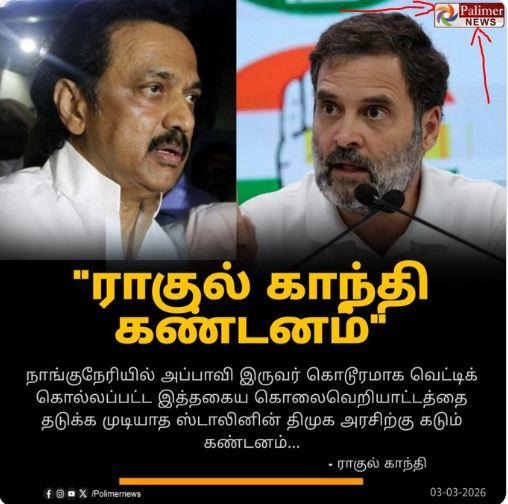 ‘‘நாங்குநேரி சம்பவம் தொடர்பாக திமுக அரசுக்கு ராகுல் காந்தி கண்டனம்,’’ என்று கூறி, சமூக வலைதளங்களில் பரவும் தகவல் பற்றி ஆய்வு மேற்கொண்டோம்.