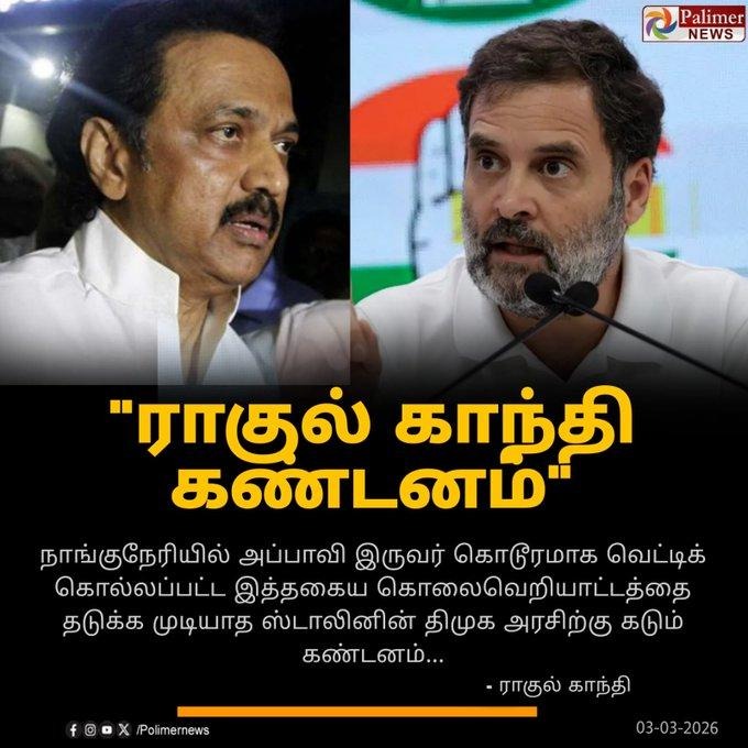 இதில், ‘’ நாங்குநேரியில் அப்பாவி இருவர் கொடூரமாக வெட்டிக் கொல்லப்பட்ட இத்தகைய கொலைவெறியாட்டத்தை தடுக்க முடியாத ஸ்டாலினின் திமுக அரசிற்கு ராகுல் காந்தி கண்டனம்.’’ என்று எழுதப்பட்டுள்ளது.