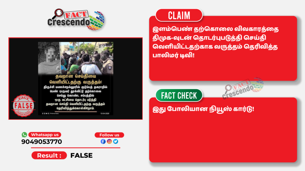 இளம்பெண் தற்கொலை விவகாரத்தை திமுக-வுடன் தொடர்புபடுத்தி செய்தி வெளியிட்டதற்காக வருத்தம் தெரிவித்த பாலிமர் டிவி என்று பரவும் நியூஸ் கார்டு போலியானது என்பதை தகுந்த ஆதாரங்கள் அடிப்படையில் ஃபேக்ட் கிரஸண்டோ தமிழ் உறுதி செய்துள்ளது. எனவே, இத்தகைய தவறான செய்தி, புகைப்படங்கள், வீடியோ போன்றவற்றை உறுதி செய்யாமல் மற்றவர்களுக்குப் பகிர வேண்டாம் என கேட்டுக் கொள்கிறோம். வாசகர்கள் தங்களுக்கு சந்தேகம் என்று தோன்றும் தகவல், பதிவு, புகைப்படம், வீடியோவை எங்களது வாட்ஸ் ஆப் எண்ணிற்கு (+91 9049053770) அனுப்பினால், அதுபற்றி ஆய்வு செய்து உண்மை விவரத்தை வெளியிடுகிறோம்.