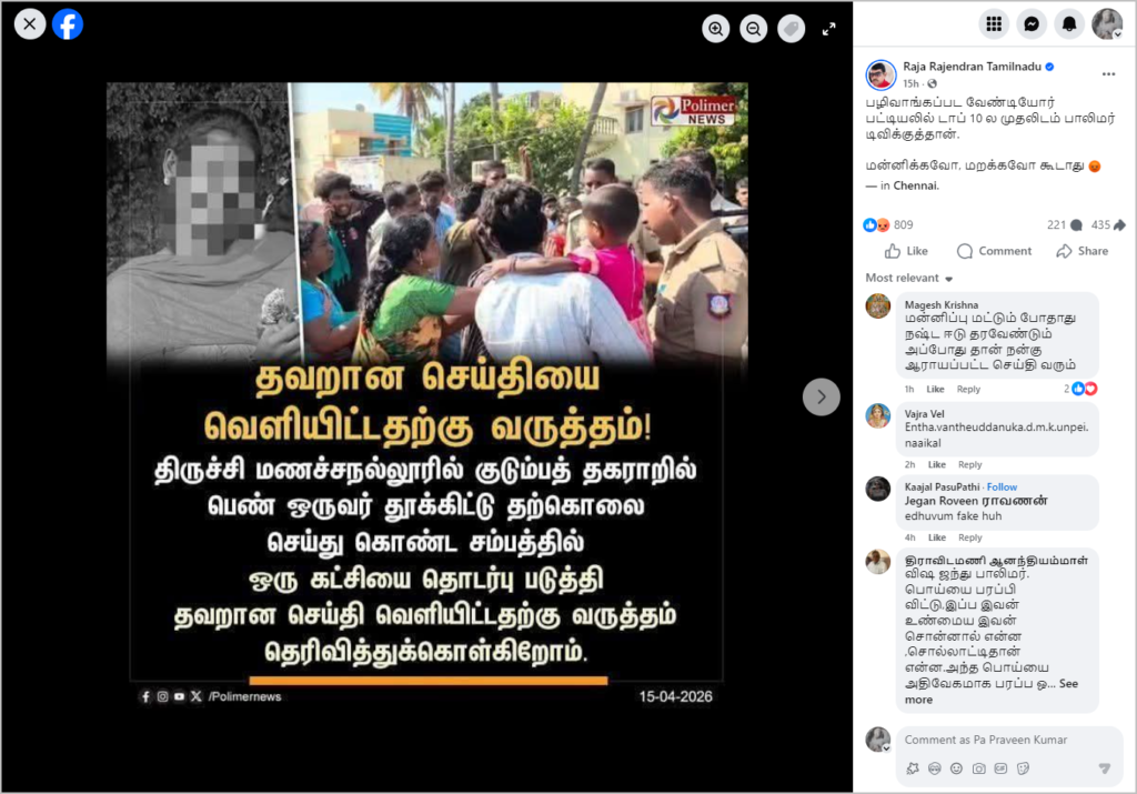 பாலிமர் டிவி வெளியிட்டது போன்று நியூஸ் கார்டு ஃபேஸ்புக்கில் பதிவிடப்பட்டுள்ளது. அதில், “தவறான செய்தியை வெளியிட்டதற்கு வருத்தம்! திருச்சி மணச்சநல்லூரில் குடும்பத் தகராறில் பெண் ஒருவர் தூக்கிட்டு தற்கொலை செய்து கொண்ட சம்பவத்தில் ஒரு கட்சியை தொடர்பு படுத்தி தவறான செய்தி வெளியிட்டதற்கு வருத்தம் தெரிவித்துக்கொள்கிறோம்” என்று குறிப்பிடப்பட்டிருந்தது. இந்த நியூஸ் கார்டை பலரும் சமூக ஊடகங்களில் பதிவிட்டு வருகின்றனர்.