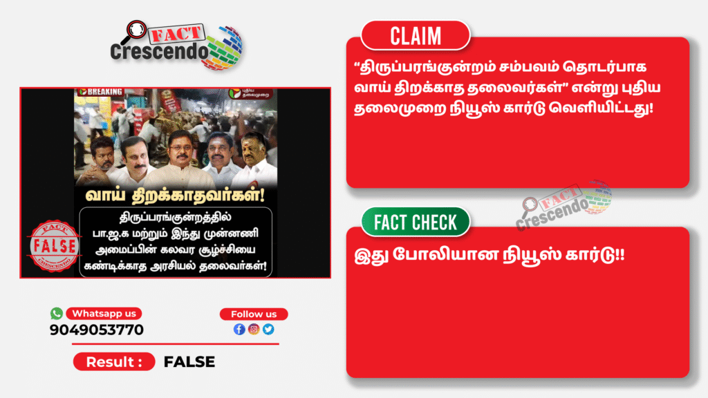 திருப்பரங்குன்றம் சம்பவம் தொடர்பாக வாய் திறக்காத தலைவர்கள் என்று புதிய தலைமுறை நியூஸ் கார்டு வெளியிட்டது என்று பரவும் நியூஸ் கார்டு போலியானது என்பதை தகுந்த ஆதாரங்கள் அடிப்படையில் ஃபேக்ட் கிரஸண்டோ தமிழ் உறுதி செய்துள்ளது. எனவே, நமது வாசகர்கள், இத்தகைய தவறான செய்தி, புகைப்படங்கள், வீடியோ போன்றவற்றை உறுதி செய்யாமல் மற்றவர்களுக்குப் பகிர வேண்டாம் என கேட்டுக் கொள்கிறோம். வாசகர்கள் தங்களுக்கு சந்தேகம் என்று தோன்றும் தகவல், பதிவு, புகைப்படம், வீடியோவை எங்களது வாட்ஸ் ஆப் எண்ணிற்கு (+91 9049053770) அனுப்பினால், அதுபற்றி ஆய்வு செய்து உண்மை விவரத்தை வெளியிடுகிறோம்.