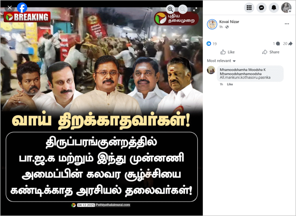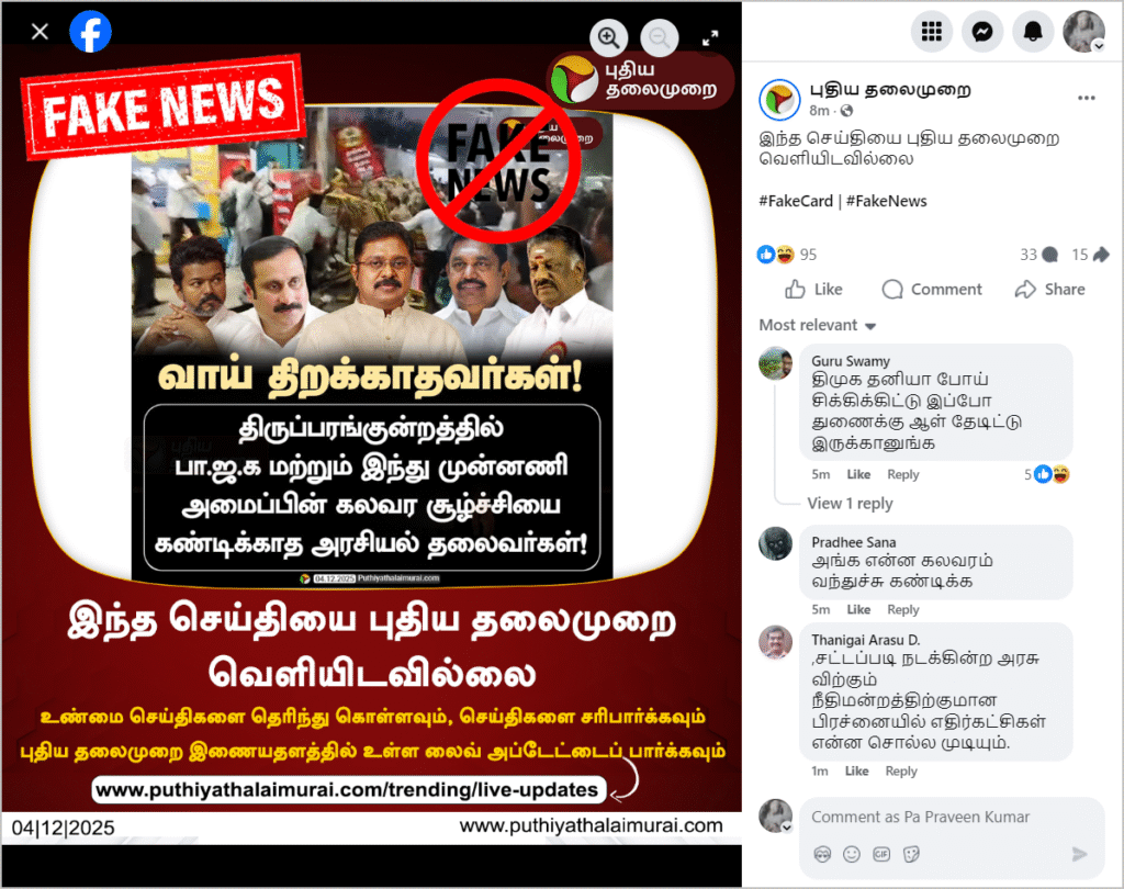 விஜய், அன்புமணி, டிடிவி தினகரன், எடப்பாடி பழனிசாமி, ஓ.பன்னீர்செல்வம் ஆகியோர் புகைப்படங்களுடன் புதிய தலைமுறை வெளியிட்டது போன்று நியூஸ் கார்டு ஃபேஸ்புக்கில் பதிவிடப்பட்டுள்ளது. நிலைத் தகவலில், “வாய் திறக்காதவர்கள்! திருப்பரங்குன்றத்தில் பா.ஜ.க மற்றும் இந்து முன்னணி அமைப்பின் கலவர சூழ்ச்சியை கண்டிக்காத அரசியல் தலைவர்கள்!” என்று குறிப்பிடப்பட்டிருந்தது. இந்த நியூஸ் கார்டை பலரும் சமூக ஊடகங்களில் வைரலாக பகிர்ந்து வருகின்றனர்.