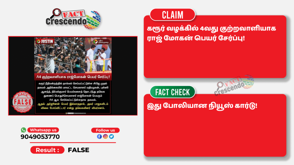 Title:“A4 குற்றவாளியாக ராஜ் மோகன் பெயர் சேர்ப்பு” என்று பரவும் நியூஸ் கார்டு உண்மையா?