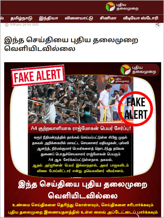 இந்த நியூஸ் கார்டில் ஆதவ் அர்ஜூனா பெயர் ஆதவ் அர்ஜூனன் என்று தவறாகக் குறிப்பிடப்பட்டிருந்தது. தமிழ் பாஃண்டும் வழக்கமாக புதிய தலைமுறை வெளியிடும் நியூஸ் கார்டில் உள்ளது போல் இல்லை. எனவே, இந்த நியூஸ் கார்டு தொடர்பாக ஆய்வு செய்தோம். புதிய தலைமுறை 2025 அக்டோபர் 24ம் தேதி வெளியிட்டிருந்த நியூஸ் கார்டுகளை பார்வையிட்டோம். ஆனால், அதில் நாம் ஆய்வுக்கு எடுத்துக்கொண்டது போன்ற நியூஸ் கார்டை புதிய தலைமுறை வெளியிடவில்லை என்பது தெரியவந்தது.