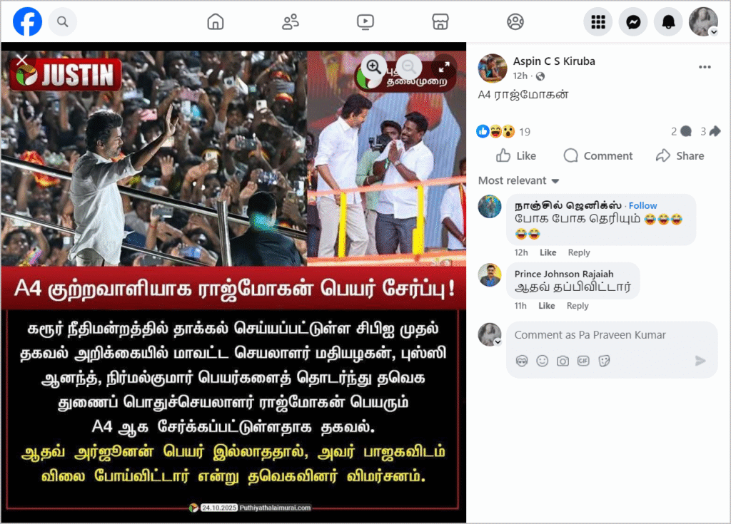 புதிய தலைமுறை வெளியிட்டது போன்று நியூஸ்கார்டு ஃபேஸ்புக்கில் பதிவிடப்பட்டுள்ளது. அதில், “A4 குற்றவாளியாக ராஜ்மோகன் பெயர் சேர்ப்பு! கரூர் நீதிமன்றத்தில் தாக்கல் செய்யப்பட்டுள்ள சிபிஐ முதல் தகவல் அறிக்கையில் மாவட்ட செயலாளர் மதியழகன், புஸ்ஸி ஆனந்த், நிர்மல்குமார் பெயர்களைத் தொடர்ந்து தவெக துணைப் பொதுச்செயலாளர் ராஜ்மோகன் பெயரும் A4 ஆக சேர்க்கப்பட்டுள்ளதாக தகவல். ஆதவ் அர்ஜூனன் பெயர் இல்லாததால், அவர் பாஜகவிடம் விலை போய்விட்டார் என்று தவெகவினர் விமர்சனம்” என்று குறிப்பிடப்பட்டிருந்தது. இந்த நியூஸ் கார்டை பலரும் சமூக ஊடகங்களில் பதிவிட்டு வருகின்றனர்.