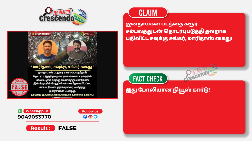 ஜனநாயகன் படத்தை கரூர் சம்பவத்துடன் தொடர்புபடுத்தி தவறாக பதிவிட்ட சவுக்கு சங்கர், மாரிதாஸ் கைது என்று பரவும் நியூஸ் கார்டு தவறானது, போலியானது என்பதை தகுந்த ஆதாரங்கள் அடிப்படையில் ஃபேக்ட் கிரஸண்டோ தமிழ் உறுதி செய்துள்ளது. எனவே, இத்தகைய தவறான செய்தி, புகைப்படங்கள், வீடியோ போன்றவற்றை உறுதி செய்யாமல் மற்றவர்களுக்குப் பகிர வேண்டாம் என கேட்டுக் கொள்கிறோம். வாசகர்கள் தங்களுக்கு சந்தேகம் என்று தோன்றும் தகவல், பதிவு, புகைப்படம், வீடியோவை எங்களது வாட்ஸ் ஆப் எண்ணிற்கு (+91 9049053770) அனுப்பினால், அதுபற்றி ஆய்வு செய்து உண்மை விவரத்தை வெளியிடுகிறோம்.