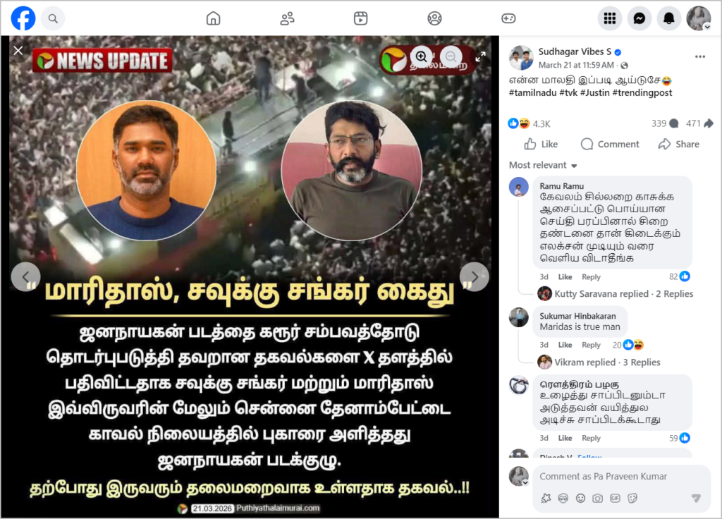 புதிய தலைமுறை வௌியிட்டது போன்று நியூஸ் கார்டு ஃபேஸ்புக்கில் பதிவிடப்பட்டுள்ளது. அதில், “மாரிதாஸ், சவுக்கு சங்கர் கைது. ஜனநாயகன் படத்தை கரூர் சம்பவத்தோடு தொடர்புபடுத்தி தவறான தகவல்களை x தளத்தில் பதிவிட்டதாக சவுக்கு சங்கர் மற்றும் மாரிதாஸ் இவ்விருவரின் மேலும் சென்னை தேனாம்பேட்டை காவல் நிலையத்தில் புகார் அளித்தது ஜனநாயகன் படக்குழு. தற்போது இருவரும் தலைமறைவாக உள்ளதாக தகவல்” என்று குறிப்பிடப்பட்டிருந்தது. இந்த நியூஸ் கார்டை பலரும் சமூக ஊடகங்களில் பதிவிட்டு வருகின்றனர்.