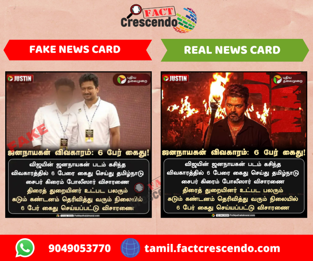 Title: ‘ஜனநாயகன் விவகாரத்தில் கைது’ என்று உதயநிதி புகைப்படத்துடன் பரவும் நியூஸ் கார்டு உண்மையா?