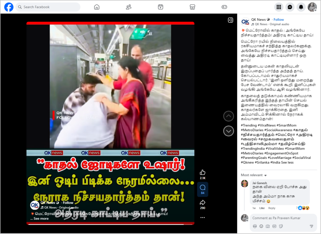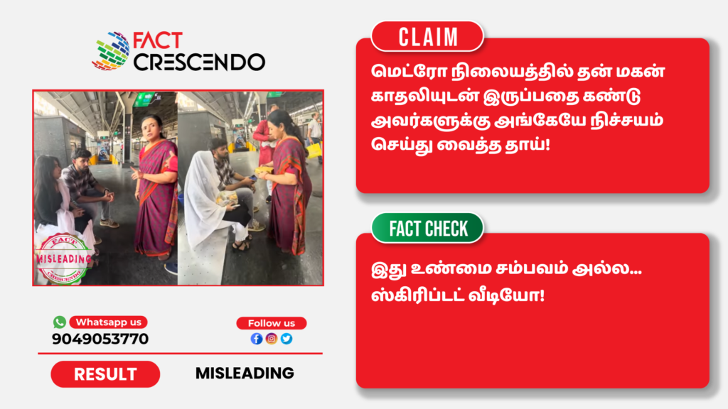 ஸ்கிரிப்டட் நாடாக வீடியோக்கள் யூடியூப் உள்ளிட்ட சமூக ஊடகங்களில் தொடர்ந்து வெளியிடப்பட்டு வருகிறது. அதை உண்மை என்று நம்பி பலரும் அதை சமூக ஊடகங்களில் பகிர்ந்த வருகின்றனர். அந்த வகையில், மெட்ரோ ஸ்டேஷனில் தன்னுடைய மகன் தன் காதலியுடன் அமர்ந்திருந்ததைக் கண்ட தாய் ஒருவர், அவர்களுக்கு அங்கேயே நிச்சயதார்த்தம் செய்து வைத்தார் என்று ஒரு வீடியோ தற்போது வைரலாக பகிரப்பட்டு வருகிறது.