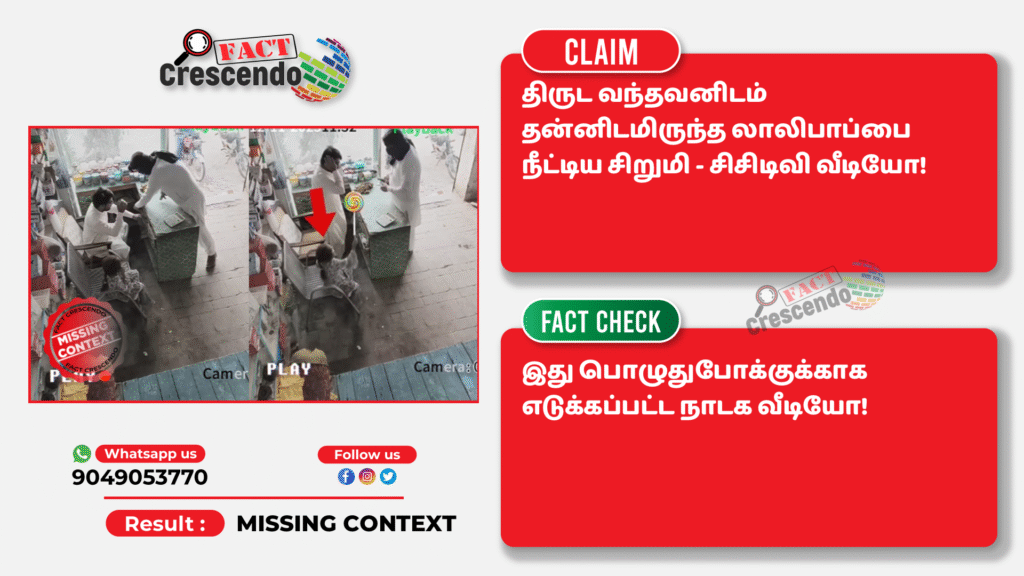 திருட வந்தவனிடம் தன்னிடமிருந்த லாலிபாப்பை நீட்டிய சிறுமி என்று பரவும் வீடியோ ஸ்கிரிப்டட் வீடியோ என்பதை தகுந்த ஆதாரங்கள் அடிப்படையில் ஃபேக்ட் கிரஸண்டோ தமிழ் உறுதி செய்துள்ளது. எனவே, நமது வாசகர்கள், இத்தகைய தவறான செய்தி, புகைப்படங்கள், வீடியோ போன்றவற்றை உறுதி செய்யாமல் மற்றவர்களுக்குப் பகிர வேண்டாம் என கேட்டுக் கொள்கிறோம். வாசகர்கள் தங்களுக்கு சந்தேகம் என்று தோன்றும் தகவல், பதிவு, புகைப்படம், வீடியோவை எங்களது வாட்ஸ் ஆப் எண்ணிற்கு (+91 9049053770) அனுப்பினால், அதுபற்றி ஆய்வு செய்து உண்மை விவரத்தை வெளியிடுகிறோம்.