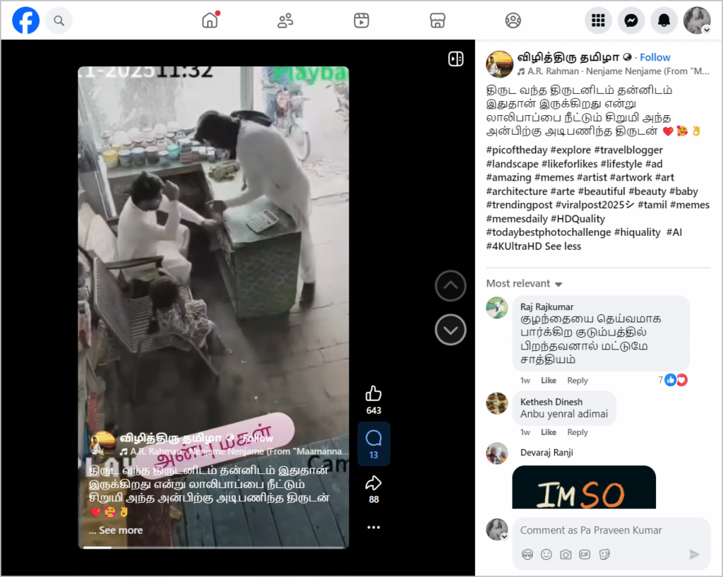 கடை ஒன்றில் உரிமையாளரும் அவருக்கு அருகில் சிறுமி ஒருவரும் அமர்ந்திருக்க, கொள்ளையன் வந்து உரிமையாளரை அடித்து பணத்தைத் திருடுவது போன்று வீடியோ ஃபேஸ்புக்கில் பதிவிடப்பட்டுள்ளது. கொள்ளையனிடம் சிறுமி தன்னிடமிருந்த லாலிபாப்பை நீட்ட, திகைத்துப்போன கொள்ளையன் மனம் திருந்தி பணத்தை கொடுத்துவிட்டு, சிறுமியின் தலையில் முத்தமிட்டுவிட்டு வெளியேறுவது போன்று வீடியோவில் இடம் பெற்றிருந்தது. நிலைத் தகவலில், “திருட வந்த திருடனிடம் தன்னிடம் இதுதான் இருக்கிறது என்று லாலிபாப்பை நீட்டும் சிறுமி அந்த அன்பிற்கு அடிபணிந்த திருடன்” என்று குறிப்பிடப்பட்டிருந்தது. இந்த வீடியோவை பலரும் சமூக ஊடகங்களில் பதிவிட்டு வருகின்றனர்.