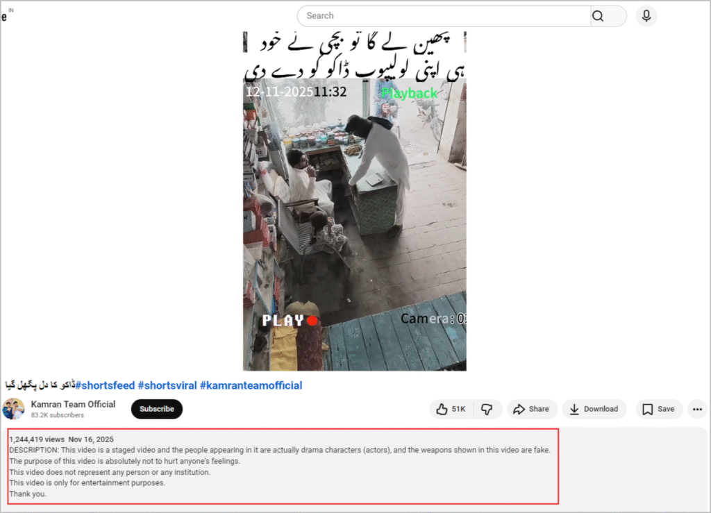 அதில், “இது உண்மையான வீடியோ இல்லை. இந்த வீடியோவில் இடம் பெற்றவர்கள் உண்மையில் நடிகர்கள். வீடியோவில் காட்டப்படும் ஆயுதம் போலியானது. வெறும் பொழுதுபோக்குக்காக மட்டும் உருவாக்கப்பட்ட வீடியோ இது” என்று குறிப்பிடப்பட்டிருந்தது. Kamran Team Official என்ற யூடியூப் சேனல் இந்த வீடியோவை வெளியிட்டிருந்தது.