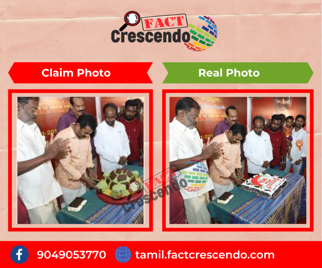 ‘’ ஆமை வடிவ கேக் வெட்டி பிறந்த நாள் கொண்டாடிய சீமான்’’ என்று சமூக வலைதளங்களில் பகிரப்படும் புகைப்படங்கள் பற்றி ஆய்வு செய்தோம்.