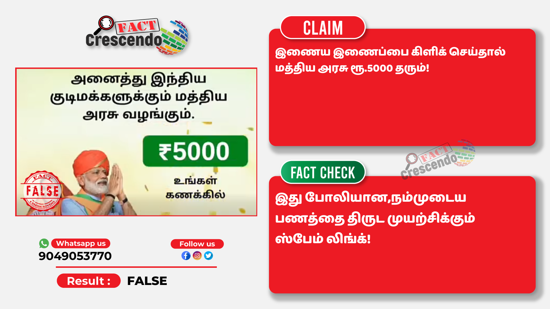 இணைய இணைப்பை கிளிக் செய்தால் மத்திய அரசு ரூ.5000 தரும் என்று பரவும் தகவல் தவறானது. இத்தகைய தவறான செய்தி, புகைப்படங்கள், வீடியோ போன்றவற்றை உறுதி செய்யாமல் மற்றவர்களுக்குப் பகிர வேண்டாம் என கேட்டுக் கொள்கிறோம். வாசகர்கள் தங்களுக்கு சந்தேகம் என்று தோன்றும் தகவல், பதிவு, புகைப்படம், வீடியோவை எங்களது வாட்ஸ் ஆப் எண்ணிற்கு (+91 9049053770) அனுப்பினால், அதுபற்றி ஆய்வு செய்து உண்மை விவரத்தை வெளியிடுகிறோம்.