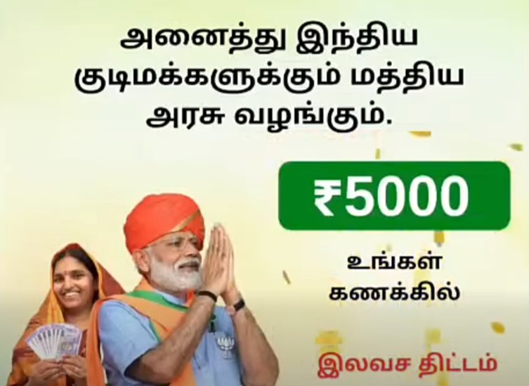 அனைத்து இந்தியக் குடிமக்களுக்கும் மத்திய அரசு ரூ.5000 வழங்குகிறது என்றும், வீடியோவில் தேசியக் கொடியை கிளிக் செய்தால் ரூ.5000 கிடைக்கும் என்றெல்லாம் ஒரு வதந்தி சமூக ஊடகங்களில் பகிரப்பட்டு வருகிறது. இது தொடர்பாக ஆய்வு செய்தோம்.