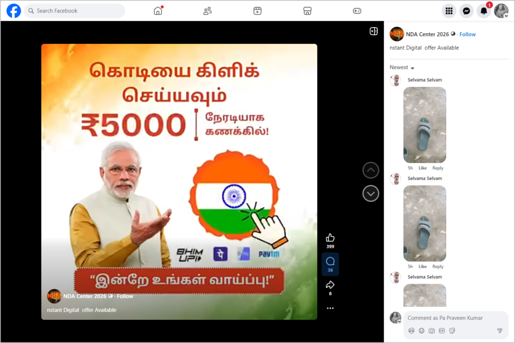 பிரதம மந்திரியின் முத்ரா திட்டத்தின் கீழ் அனைத்து இந்தியக் குடி மக்களுக்கும் மத்திய அரசு வழங்கும் ரூ.5000 உங்கள் கணக்கில் இலவசத் திட்டம். இணைப்பைக் கிளிக் செய்து உங்கள் கணக்கில் பணத்தைப் பெறுங்கள்” என்று வீடியோ பதிவு ஒன்று ஃபேஸ்புக்கில் பதிவிடப்பட்டுள்ளது. அதே போன்று, கொடியை கிளிக் செய்யவும் ரூ.5000 நேரடியாக கணக்கில். இன்றே உங்கள் வாய்ப்பு” என்று குறிப்பிட்டு மற்றொரு பதிவு ஃபேஸ்புக்கில் பதிவிடப்பட்டுள்ளது. இதை பலரும் பகிர்ந்து வருகின்றனர்.