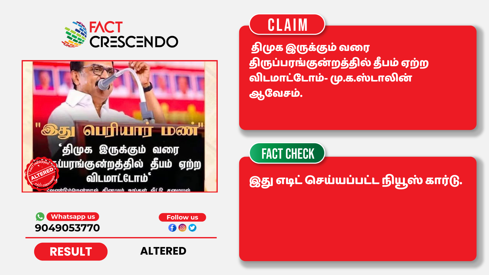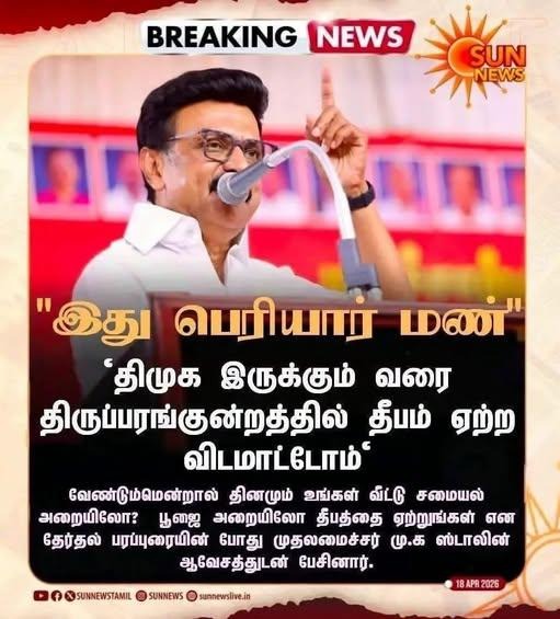 இதில், ‘’ இது பெரியார் மண். ‘திமுக இருக்கும் வரை திருப்பரங்குன்றத்தில் தீபம் ஏற்ற விடமாட்டோம்’ வேண்டும்மென்றால் தினமும் உங்கள் வீட்டு சமையல் அறையிலோ? பூஜை அறையிலோ தீபத்தை ஏற்றுங்கள் என தேர்தல் பரப்புரையின் போது முதலமைச்சர் மு.க ஸ்டாலின் ஆவேசத்துடன் பேசினார்.,’’ என்று எழுதப்பட்டுள்ளது.