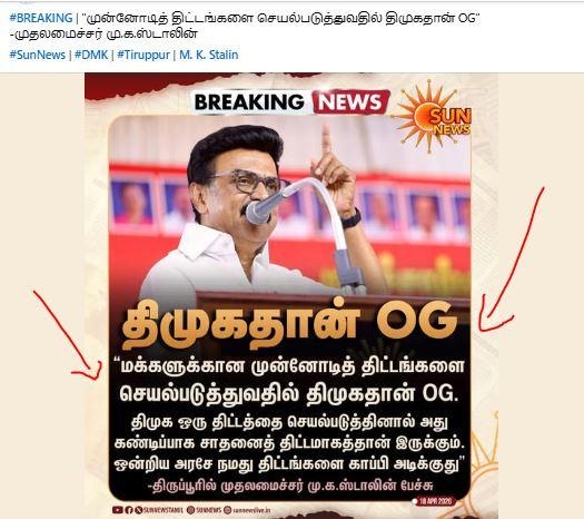 இதன்படி, உண்மையான நியூஸ் கார்டில், ‘’திமுகதான் OG ‘’மக்களுக்கான முன்னோடித் திட்டங்களை செயல்படுத்துவதில் திமுகதான் OG. திமுக ஒரு திட்டத்தை செயல்படுத்தினால் அது கண்டிப்பாக சாதனைத் திட்டமாகத்தான் இருக்கும். ஒன்றிய அரசே நமது திட்டங்களை காப்பி அடிக்குது”- திருப்பூரில் முதலமைச்சர் மு.க.ஸ்டாலின் பேச்சு..’’ என்றுதான் எழுதப்பட்டுள்ளது.