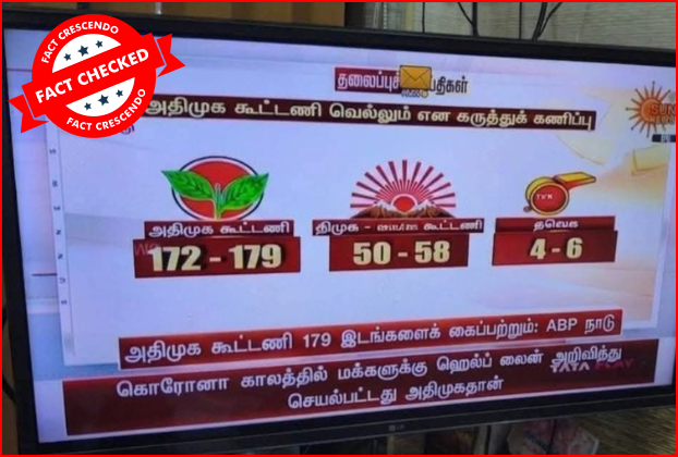 தமிழ்நாடு சட்டமன்ற தேர்தலில் அதிமுக கூட்டணி வெல்லும் என்று ஏபிபி நாடு கருத்துக்கணிப்பு வௌியிட்டதாக சன் நியூஸ் செய்தி வெளியிட்டது போன்று ஒரு புகைப்படம் சமூக ஊடகங்களில் வைரலாக பகிரப்பட்டு வருகிறது. இது தொடர்பாக ஆய்வு செய்தோம். தகவலின் விவரம்: உண்மைப் பதிவைக் காண: Facebook I Archive தொலைக்காட்சியில் ஒளிபரப்பான சன் நியூஸ் செய்தியை புகைப்படம் எடுத்து ஃபேஸ்புக்கில் பதிவிட்டுள்ளனர். அதில், “அதிமுக கூட்டணி வெல்லும் என கருத்துக் கணிப்பு. அதிமுக கூட்டணி 179 இடங்களைக் […]