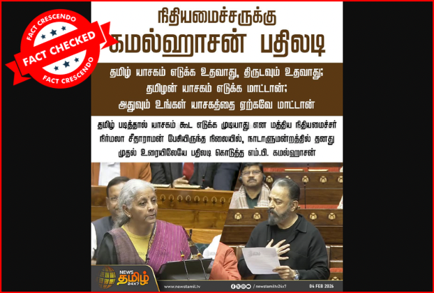 தமிழ் படித்தால் யாசகம் கூட எடுக்க முடியாது என்று கூறிய நிர்மலா சீதாராமனுக்கு கமல்ஹாசன் பதிலடி கொடுத்துள்ளார் என்று ஒரு பதிவு சமூக ஊடகங்களில் பகிரப்பட்டு வருகிறது. உண்மையில் நிர்மலா சீதாராமன் அப்படிக் கூறியிருந்தாரா… உண்மை என்ன என்று அறிய ஆய்வு செய்தோம். தகவலின் விவரம்: உண்மைப் பதிவைக் காண: Facebook I Archive தமிழ் ஊடகம் ஒன்று வெளியிட்டிருந்த நியூஸ் கார்டை ஃபேஸ்புக்கில் பதிவிட்டுள்ளனர். அதில், “நிதியமைச்சருக்கு கமல்ஹாசன் பதிலடி தமிழ் யாசகம் எடுக்க உதவாது, […]