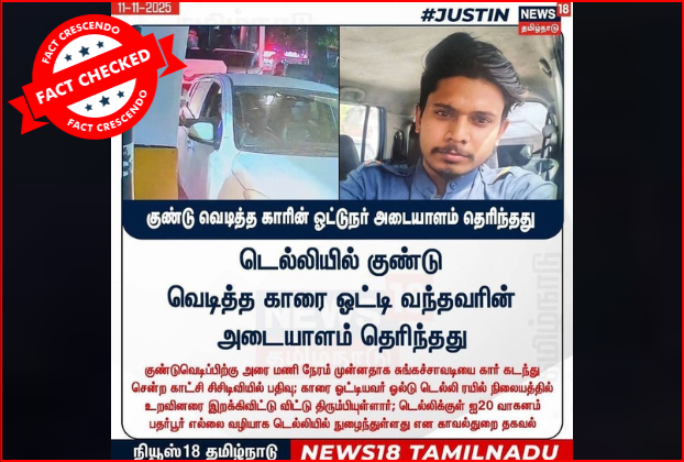 ‘’டெல்லியில் குண்டு வெடித்த காரை ஓட்டி வந்த நபர்,’’ என்று கூறி, சமூக வலைதளங்களில் பகிரப்படும் ஒரு தகவல் பற்றி ஆய்வு மேற்கொண்டோம். தகவலின் விவரம்: இதனை வாசகர்கள் நமக்கு வாட்ஸ்ஆப் சாட்போட் (+919049053770) வழியே அனுப்பி, உண்மையா என்று சந்தேகம் கேட்டனர். இதில், ‘’ #JUSTIN டெல்லியில் குண்டு வெடித்த காரை ஓட்டி வந்தவரின் அடையாளம் தெரிந்தது,’’ என்று எழுதப்பட்டுள்ளது. இதனுடன் புகைப்படம் ஒன்றும் இணைக்கப்பட்டுள்ளது. Claim Link 1 l Claim Link 2 […]