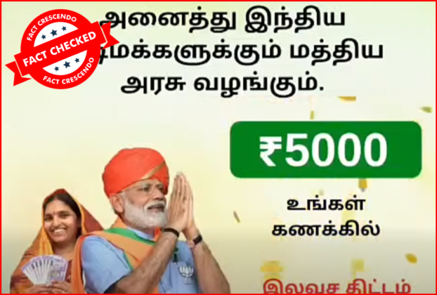 அனைத்து இந்தியக் குடிமக்களுக்கும் மத்திய அரசு ரூ.5000 வழங்குகிறது என்றும், வீடியோவில் தேசியக் கொடியை கிளிக் செய்தால் ரூ.5000 கிடைக்கும் என்றெல்லாம் ஒரு வதந்தி சமூக ஊடகங்களில் பகிரப்பட்டு வருகிறது. இது தொடர்பாக ஆய்வு செய்தோம். தகவலின் விவரம்: உண்மைப் பதிவைக் காண: Facebook I Archive பிரதம மந்திரியின் முத்ரா திட்டத்தின் கீழ் அனைத்து இந்தியக் குடி மக்களுக்கும் மத்திய அரசு வழங்கும் ரூ.5000 உங்கள் கணக்கில் இலவசத் திட்டம். இணைப்பைக் கிளிக் செய்து உங்கள் […]