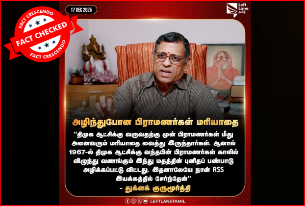 அமெரிக்காவில் கிறிஸ்தவ தேவாலயத்தை சேதப்படுத்திய ஆர்.எஸ்.எஸ் தொண்டர் என்று குறிப்பிட்டு ஒரு வீடியோ சமூக ஊடகங்களில் வைரலாக பகிரப்பட்டு வருகிறது. இது தொடர்பாக ஆய்வு செய்தோம். தகவலின் விவரம்: உண்மைப் பதிவைக் காண: Facebook I Archive கிறிஸ்தவ தேவாலயத்தின் பலிபீடத்தின் மீது ஏறி அங்கிருக்கும் பொருட்களை ஒருவர் கீழே தள்ளும்போது, அவரை காவல் துறையினர் பிடிக்கும் வீடியோ ஃபேஸ்புக்கில் பதிவிடப்பட்டுள்ளது. நிலைத் தகவலில், “அமெரிக்காவில் உள்ள தேவாலயத்தில் இந்தியாவைச் சேர்ந்த ஆர்எஸ்எஸ் சங்கிஅமைப்பை சேர்ந்தவன் தேவாலயத்தில் […]