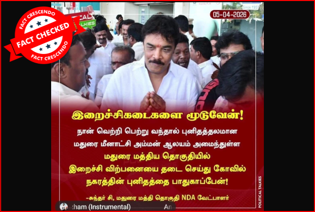 ‘‘மதுரை மத்திய தொகுதியில் இறைச்சி விற்பனையை தடை செய்வேன்,’’ என்று சுந்தர்.சி கூறியதாக, சமூக வலைதளங்களில் பரவும் தகவல் பற்றி ஆய்வு மேற்கொண்டோம். தகவலின் விவரம்: இதனை வாசகர்கள் நமக்கு வாட்ஸ்ஆப் சாட்போட் (+919049053770) வழியே அனுப்பி, உண்மையா என்று சந்தேகம் கேட்டனர். இதில், ‘’நான் வெற்றி பெற்று வந்தால் புனிதத்தலமான மதுரை மீனாட்சி அம்மன் ஆலயம் அமைந்துள்ள மதுரை மத்திய தொகுதியில் இறைச்சி விற்பனையை தடை செய்து கோவில் நகரத்தின் புனிதத்தை பாதுகாப்பேன்- சுந்தர்.சி, மதுரை […]