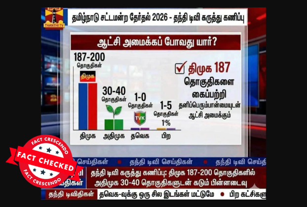 தி.மு.க கூட்டணி 187 இடங்களைக் கைப்பற்றி தனிப் பெரும்பான்மையுடன் ஆட்சி அமைக்கும் என்று தந்தி டிவி கருத்துக் கணிப்பு வெளியிட்டது போன்று ஒரு புகைப்படம் சமூக ஊடகங்களில் பகிரப்பட்டு வருகிறது. இது தொடர்பாக ஆய்வு செய்தோம். தகவலின் விவரம்: உண்மைப் பதிவைக் காண: Facebook I Archive தந்தி டிவி செய்தியை ஸ்கிரீன் ஷாட் எடுத்தது போன்று ஒரு புகைப்படம் ஃபேஸ்பக்கில் பதிவிடப்பட்டுள்ளது. அதில், “தமிழ்நாடு சட்டமன்ற தேர்தல் 2026 – தந்தி டிவி கருத்துக் கணிப்பு. […]