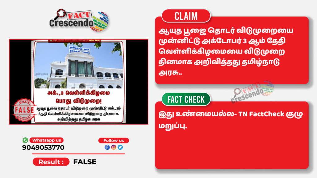 ‘’ஆயுத பூஜையை முன்னிட்டு அக்டோபர் 3 அன்று பொது விடுமுறை அறிவிக்கப்பட்டுள்ளது,’’ என்று கூறி, சமூக வலைதளங்களில் பகிரப்படும் ஒரு தகவல் பற்றி ஆய்வு மேற்கொண்டோம்.