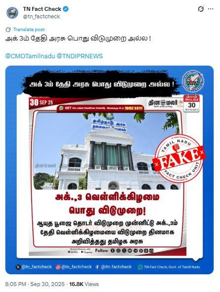 நாம் இந்த ஃபேக்ட்செக் கட்டுரை வெளியிடும் நொடி வரையிலும் அக்டோபர் 3, 2025 அன்று விடுமுறை எதுவும் தமிழ்நாடு அரசு அறிவிக்கவில்லை. ஒருவேளை மறு அறிவிப்பு வந்தால் நாம் அதனையும் அப்டேட் செய்ய தயாராக உள்ளோம்.