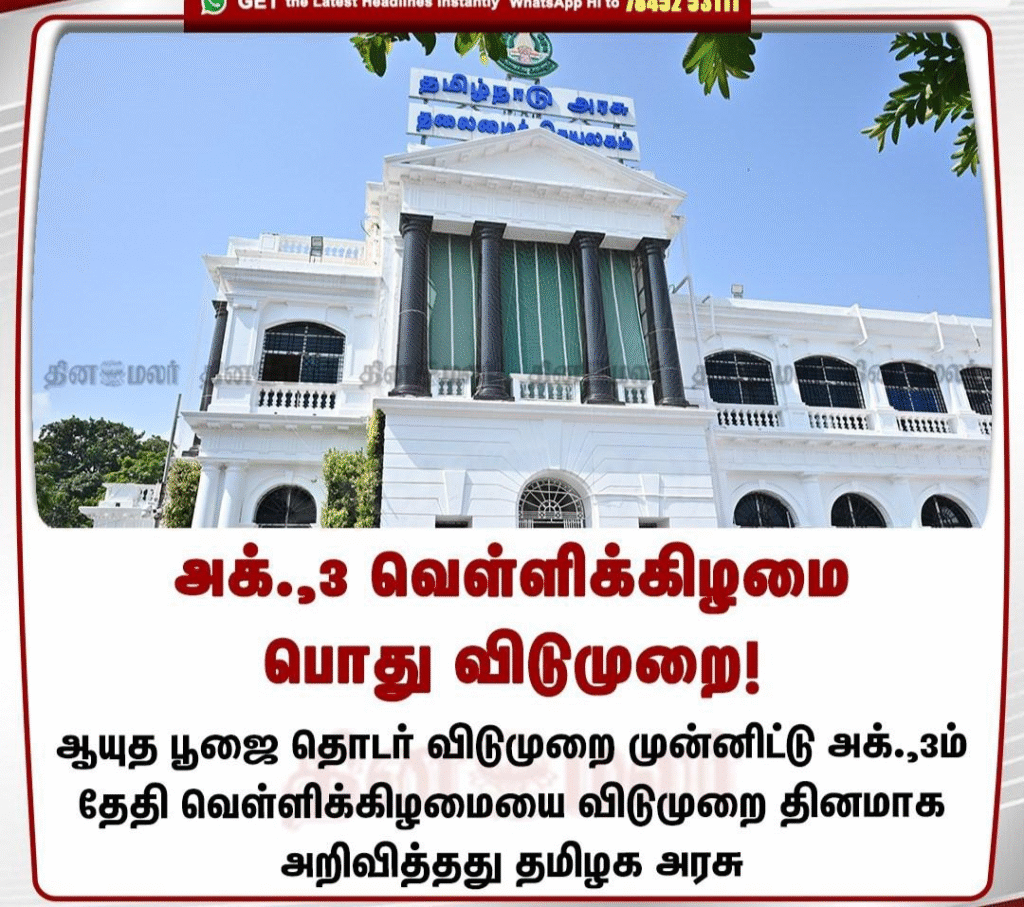ஆயுத பூஜை தொடர் விடுமுறையை முன்னிட்டு அக்டோபர் 3 ஆம் தேதி வெள்ளிக்கிழமையை விடுமுறை தினமாக அறிவித்தது தமிழ்நாடு அரசு.,’’ என்று எழுதப்பட்டுள்ளது.
