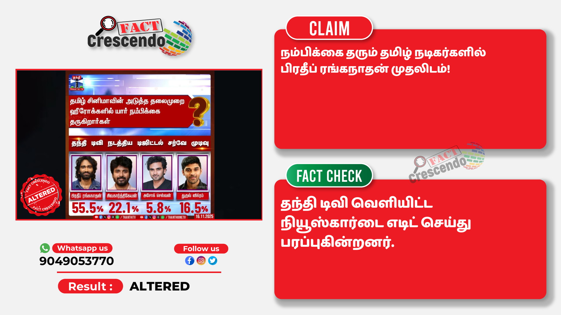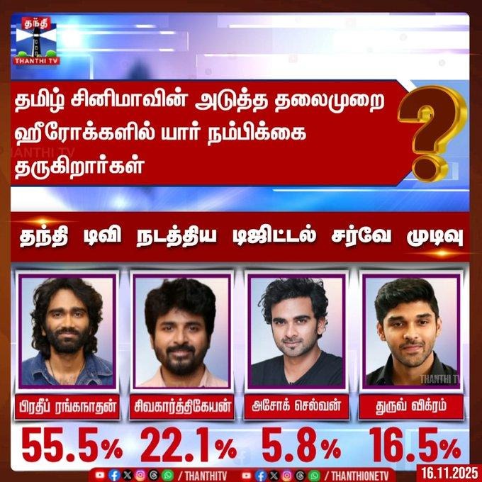 இதில், ‘’ தமிழ் சினிமாவின் அடுத்த தலைமுறை ஹீரோக்களில் யார் நம்பிக்கை தருகிறார்கள். தந்தி டிவி நடத்திய டிஜிட்டல் சர்வே முடிவு. பிரதீப் ரங்கநாதன் 55.5% வாக்குகள் பெற்று முதலிடம்,’’ என்று எழுதப்பட்டுள்ளது.