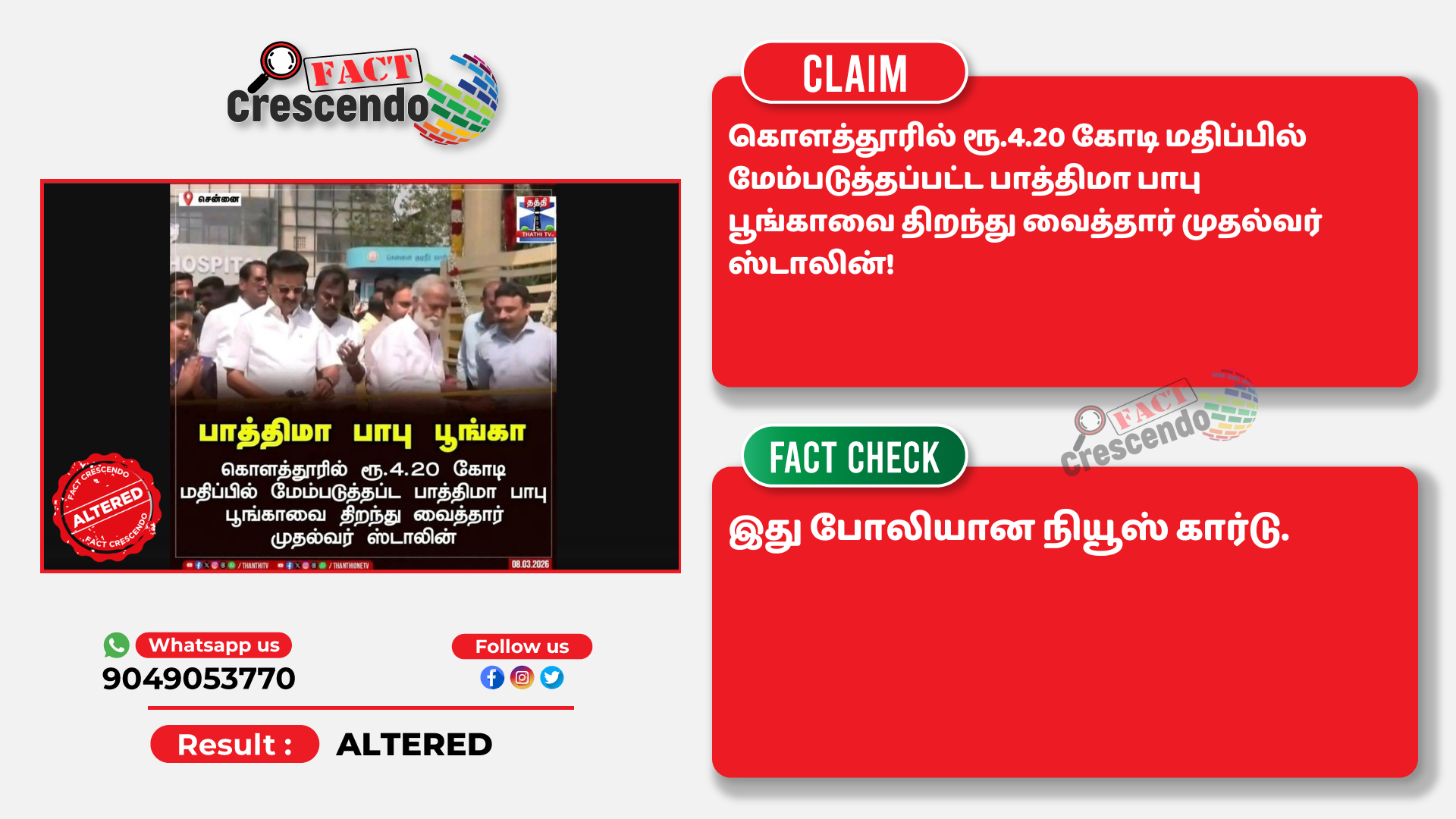 உரிய ஆதாரங்களின் அடிப்படையில் மேற்கண்ட தகவல் நம்பகமானது இல்லை என்று ஃபேக்ட் கிரஸண்டோ தமிழ் நிரூபித்துள்ளது. நமது வாசகர்கள் இத்தகைய தவறான செய்தி, புகைப்படம் மற்றும் வீடியோவை கண்டால், எங்களது வாட்ஸ் ஆப் எண்ணிற்கு (+91 9049053770) அனுப்புங்கள். நாங்கள், அதுபற்றி ஆய்வு செய்து உண்மை விவரத்தை வெளியிடுகிறோம்.