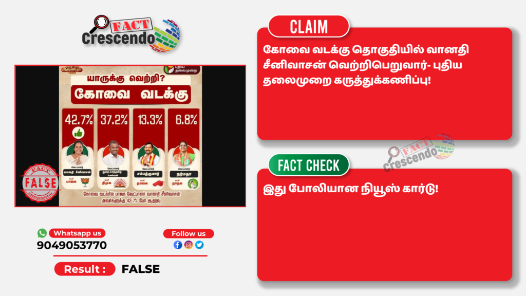 கோவை வடக்கு தொகுதியில் வானதி சீனிவாசன் வெற்றிபெறுவார் என்று புதிய தலைமுறை கருத்துக்கணிப்பு என்று பரவும் நியூஸ் கார்டு போலியானது என்பதை தகுந்த ஆதாரங்கள் அடிப்படையில் ஃபேக்ட் கிரஸண்டோ தமிழ் உறுதி செய்துள்ளது. எனவே, இத்தகைய தவறான செய்தி, புகைப்படங்கள், வீடியோ போன்றவற்றை உறுதி செய்யாமல் மற்றவர்களுக்குப் பகிர வேண்டாம் என கேட்டுக் கொள்கிறோம். வாசகர்கள் தங்களுக்கு சந்தேகம் என்று தோன்றும் தகவல், பதிவு, புகைப்படம், வீடியோவை எங்களது வாட்ஸ் ஆப் எண்ணிற்கு (+91 9049053770) அனுப்பினால், அதுபற்றி ஆய்வு செய்து உண்மை விவரத்தை வெளியிடுகிறோம்.