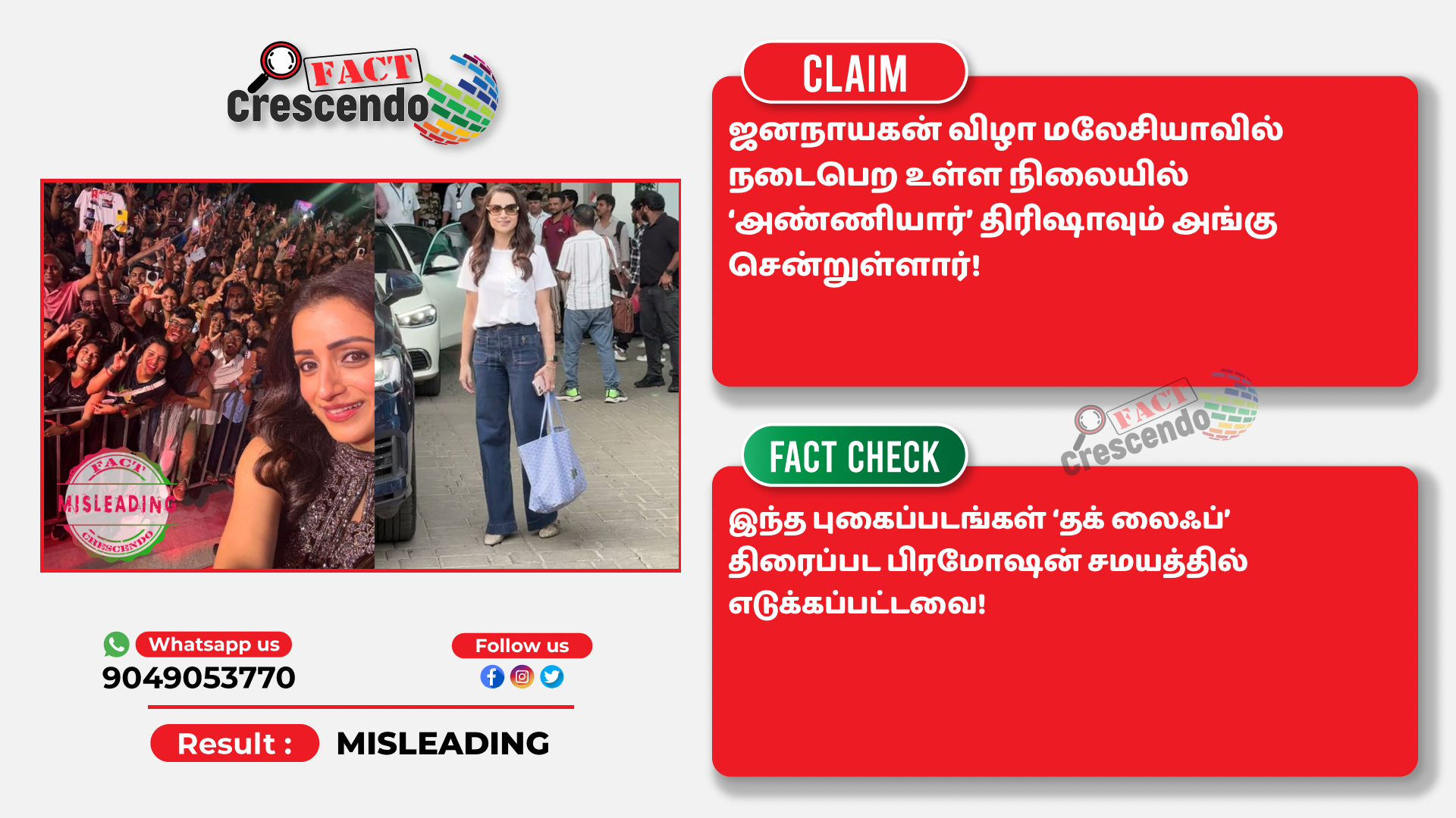 மலேசியாவில் ஜனநாயகன் பாடல்கள் வெளியீடு நடைபெறும் சூழலில் நடிகை திரிஷாவை அண்ணியார் என்று குறிப்பிட்டு அவரும் மலேசியாவுக்கு சென்றுள்ளதாக பரவும் புகைப்படங்கள் பழைய நிகழ்ச்சிகளின் போது எடுக்கப்பட்டவை என்பதை தகுந்த ஆதாரங்கள் அடிப்படையில் ஃபேக்ட் கிரஸண்டோ தமிழ் உறுதி செய்துள்ளது. எனவே, நமது வாசகர்கள், இத்தகைய தவறான செய்தி, புகைப்படங்கள், வீடியோ போன்றவற்றை உறுதி செய்யாமல் மற்றவர்களுக்குப் பகிர வேண்டாம் என கேட்டுக் கொள்கிறோம். வாசகர்கள் தங்களுக்கு சந்தேகம் என்று தோன்றும் தகவல், பதிவு, புகைப்படம், வீடியோவை எங்களது வாட்ஸ் ஆப் எண்ணிற்கு (+91 9049053770) அனுப்பினால், அதுபற்றி ஆய்வு செய்து உண்மை விவரத்தை வெளியிடுகிறோம்.