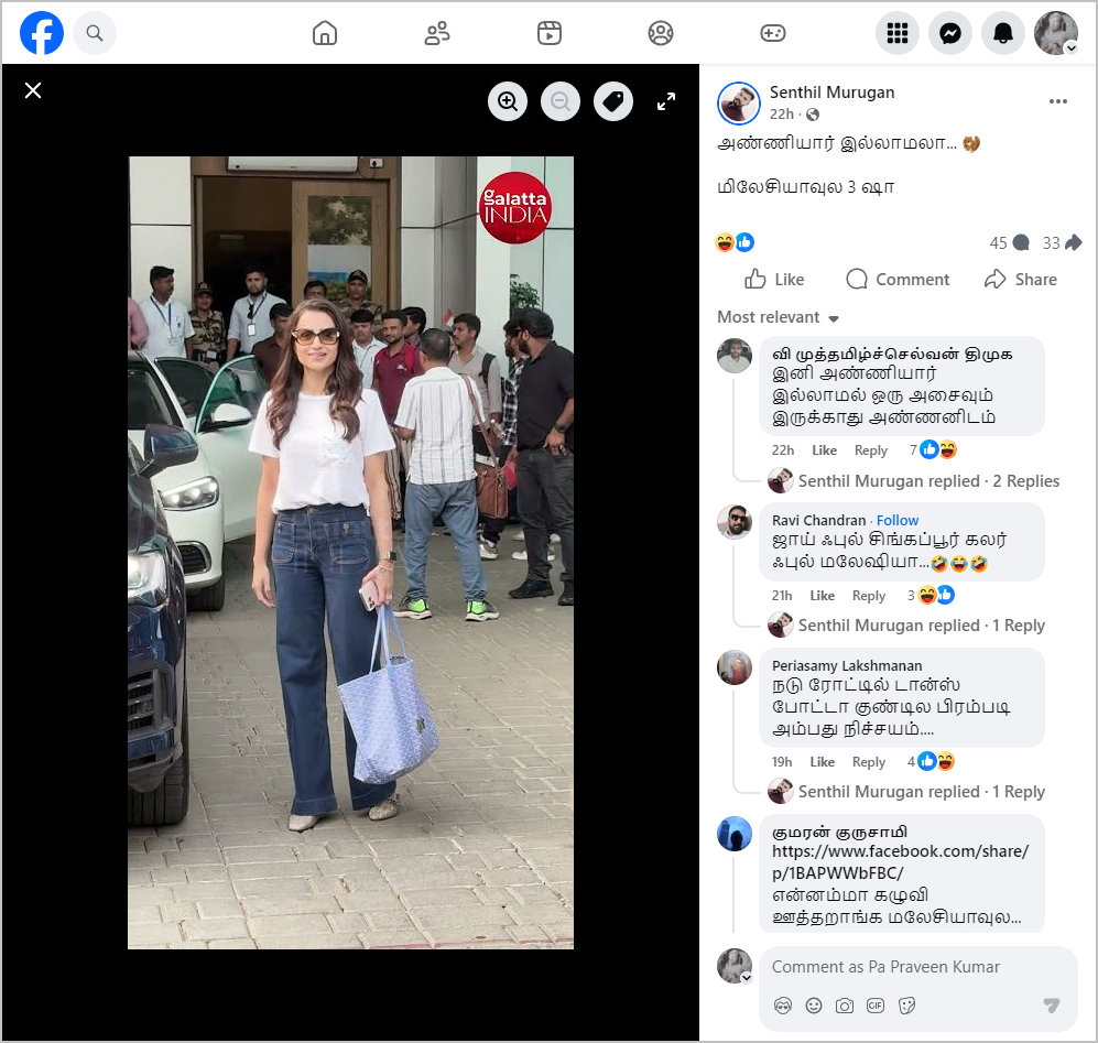 அதே போன்று புகைப்படத்திற்கு போஸ் கொடுத்தது போன்று மற்றொரு புகைப்படத்தை ஃபேஸ்புக்கில் பதிவிட்டு, “அண்ணியார் இல்லாமலா… 🐿️மிலேசியாவுல 3 ஷா” என்று குறிப்பிடப்பட்டிருந்தது. இந்த புகைப்படங்களை பலரும் சமூக ஊடகங்களில் பதிவிட்டு வருகின்றனர்.