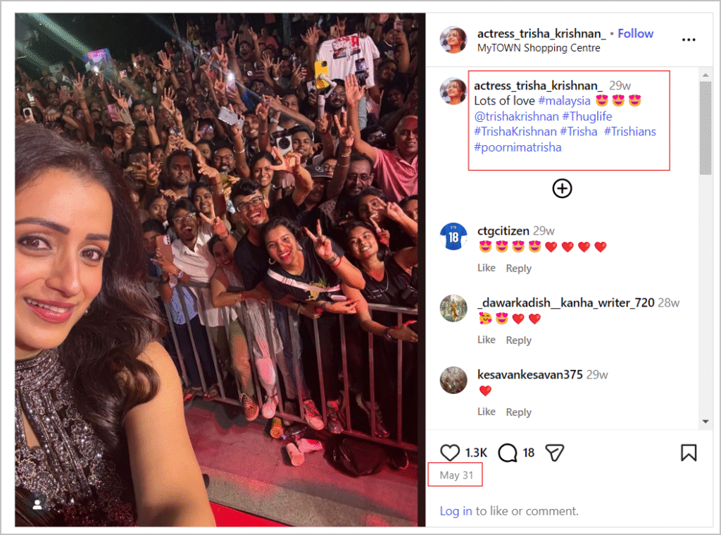 இந்த புகைப்படத்தை கூகுள் லென்ஸ் இணையதளத்தில் பதிவேற்றித் தேடினோம். அப்போது திரிஷா பெயர் கொண்ட இன்ஸ்டாகிராம் பக்கத்தில் தக் லைஃப் (Thug Life) திரைப்படத்தின் பிரமோஷனுக்காக மலேசியா சென்ற போது எடுக்கப்பட்டது என்று குறிப்பிடப்பட்டிருந்தது. அந்த புகைப்படமானது 2025 மே 31ம் தேதி இன்ஸ்டாகிராமில் பதிவிடப்பட்டிருந்தது. ஜனநாயகன் ஆடியோ லாஞ்ச் 2025 டிசம்பர் 27ம் தேதி நடந்தது. எனவே, ஜனநாயகன் படத்திற்காக நடிகை திரிஷா சென்ற புகைப்படம் இது இல்லை என்பது உறுதியாகிறது.