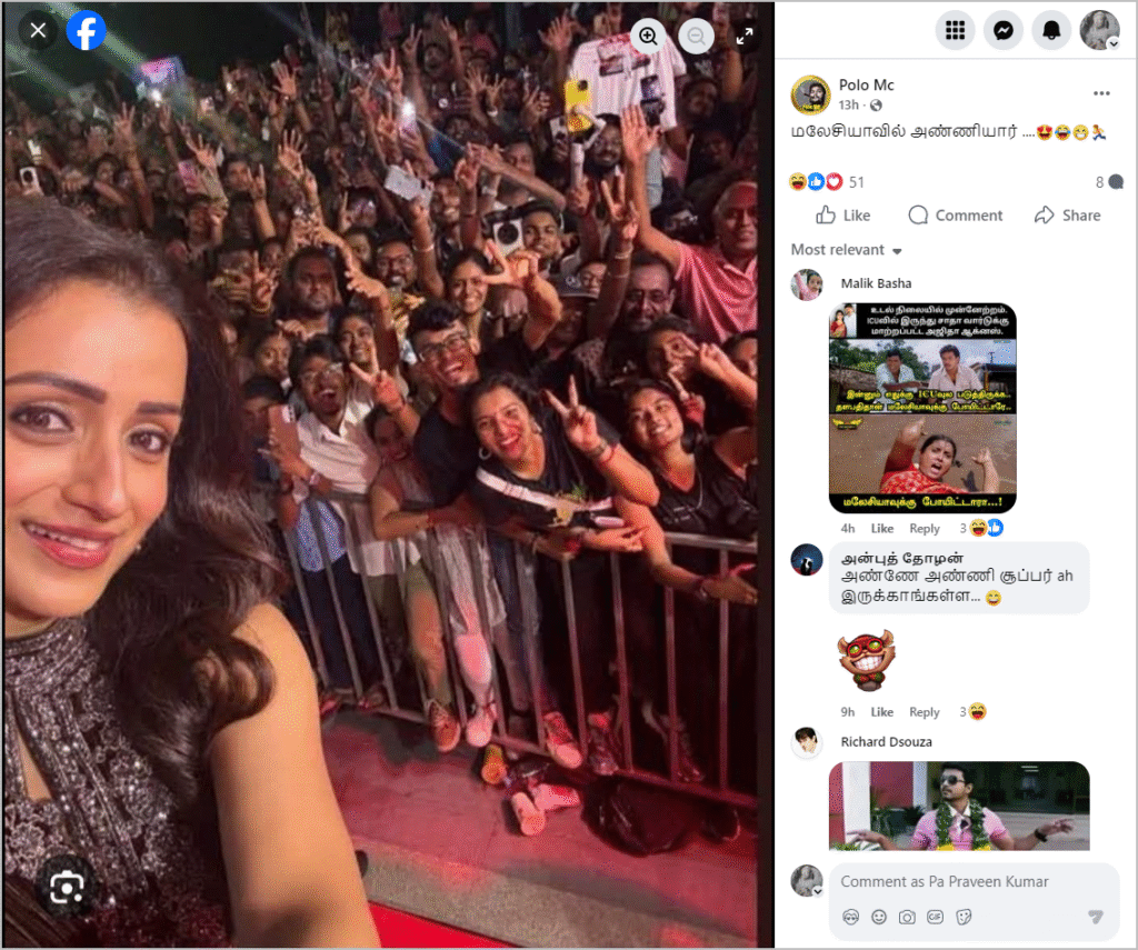 நடிகை திரிஷா ரசிகர்கள் முன்னிலையில் செல்ஃபி எடுத்துக்கொண்ட புகைப்படம் ஃபேஸ்புக்கில் பதிவிடப்பட்டுள்ளது. நிலைத்தகவலில், “மலேசியாவில் அண்ணியார் ….” என்று குறிப்பிடப்பட்டிருந்தது.