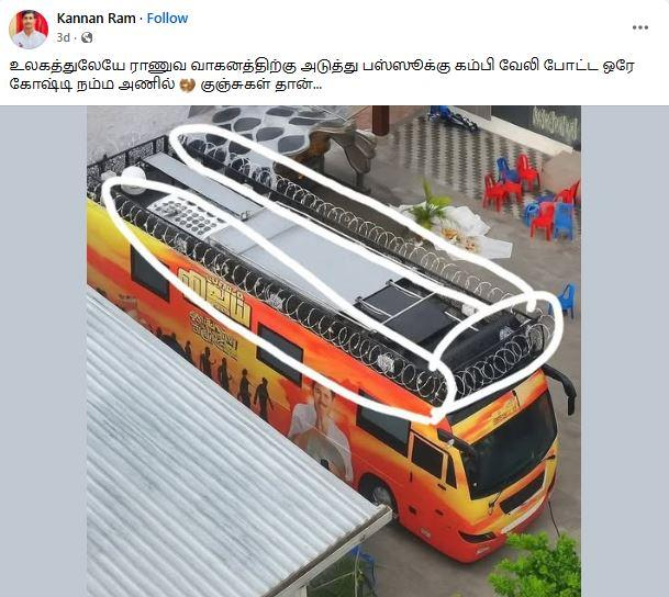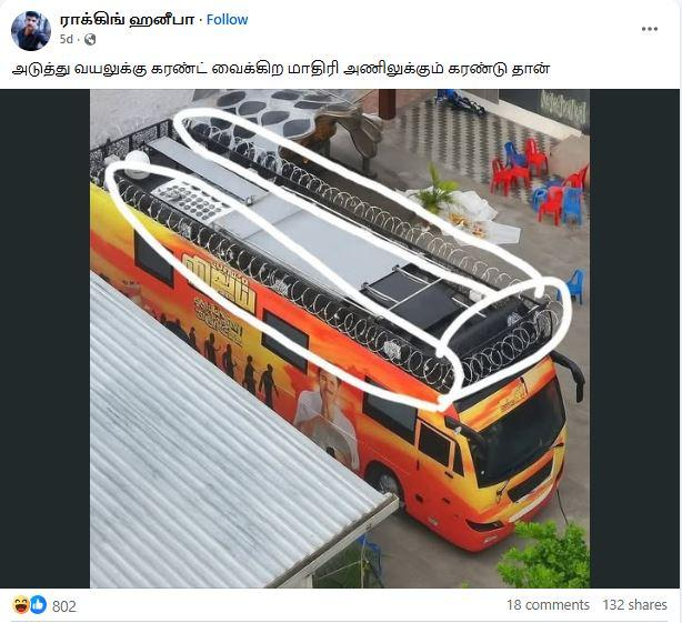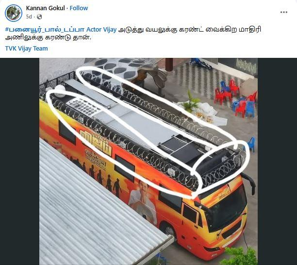 ‘’விஜய் பிரச்சார வாகனத்தின் மேற்கூரையில் கம்பி வேலி அமைக்கப்பட்டது,’’ என்று கூறி, சமூக வலைதளங்களில் பகிரப்படும் ஒரு தகவல் பற்றி ஆய்வு மேற்கொண்டோம்.