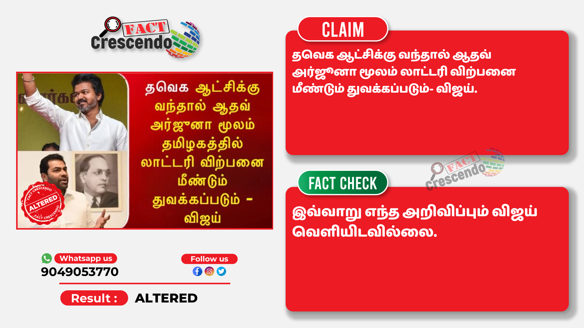 இதில், ‘’ தவெக ஆட்சிக்கு வந்தால் ஆதவ் அர்ஜூனா மூலம் லாட்டரி விற்பனை மீண்டும் துவக்கப்படும்- விஜய்’’ என்று எழுதப்பட்டுள்ளது.