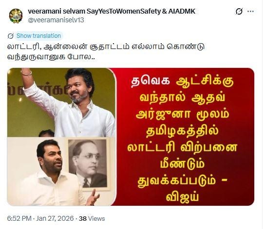 Title:தவெக ஆட்சிக்கு வந்தால் மீண்டும் லாட்டரி விற்பனை துவக்கப்படும் என்று விஜய் அறிவித்தாரா?
