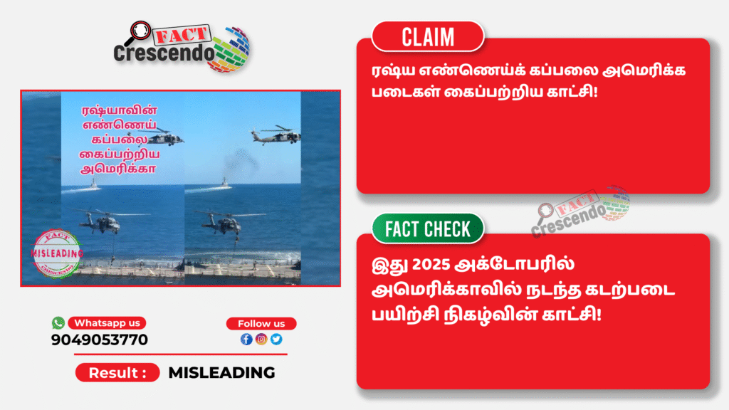 2025 அக்டோபரில் அமெரிக்காவில் நடந்த அமெரிக்க கடற்படையின் போர்ப் பயிற்சி நிகழ்வின் போது எடுக்கப்பட்ட வீடியோவை ரஷ்ய எண்ணெய்க் கப்பலை அமெரிக்க படைகள் கைப்பற்றிய காட்சி என்று தவறாக சமூக ஊடகங்களில் பகிர்ந்திருப்பதை தகுந்த ஆதாரங்கள் அடிப்படையில் ஃபேக்ட் கிரஸண்டோ தமிழ் உறுதி செய்துள்ளது. எனவே, நமது வாசகர்கள், இத்தகைய தவறான செய்தி, புகைப்படங்கள், வீடியோ போன்றவற்றை உறுதி செய்யாமல் மற்றவர்களுக்குப் பகிர வேண்டாம் என கேட்டுக் கொள்கிறோம். வாசகர்கள் தங்களுக்கு சந்தேகம் என்று தோன்றும் தகவல், பதிவு, புகைப்படம், வீடியோவை எங்களது வாட்ஸ் ஆப் எண்ணிற்கு (+91 9049053770) அனுப்பினால், அதுபற்றி ஆய்வு செய்து உண்மை விவரத்தை வெளியிடுகிறோம்.