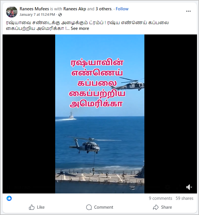 ஹெலிகாப்டரில் இருந்து ராணுவ வீரர்கள் கப்பலில் இறங்கும் வீடியோ ஃபேஸ்புக்கில் பதிவிடப்பட்டுள்ளது. அதில், “ரஷ்யாவின் எண்ணெய் கப்பலை கைப்பற்றிய அமெரிக்கா” என்று குறிப்பிடப்பட்டிருந்தது. நிலைத் தகவலில், “ரஷ்யாவை சண்டைக்கு அழைக்கும் ட்ரம்ப் ! ரஷ்ய எண்ணெய் கப்பலை கைப்பற்றிய அமெரிக்கா !