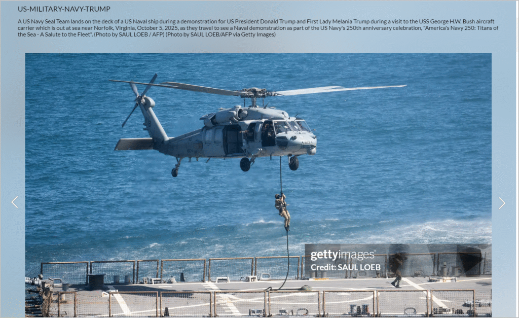 வீடியோ காட்சிகளை புகைப்படங்களாக மாற்றி கூகுள் லென்ஸ் தளத்தில் பதிவேற்றித் தேடினோம். அப்போது, இந்த காட்சியுடன் கூடிய பதிவுகள் 2025 அக்டோபரில் இருந்து சமூக ஊடகங்களில் பதிவிட்டு வந்திருந்ததைக் காண முடிந்தது. அவற்றில், அமெரிக்க அதிபர் டிரம்ப் முன்னிலையில், அமெரிக்க கடற்படையின் சீல் பிரிவினர் கப்பலில் இறங்கி போர் ஒத்திகையில் ஈடுபட்ட காட்சி என்று குறிப்பிடப்பட்டிருந்தது.