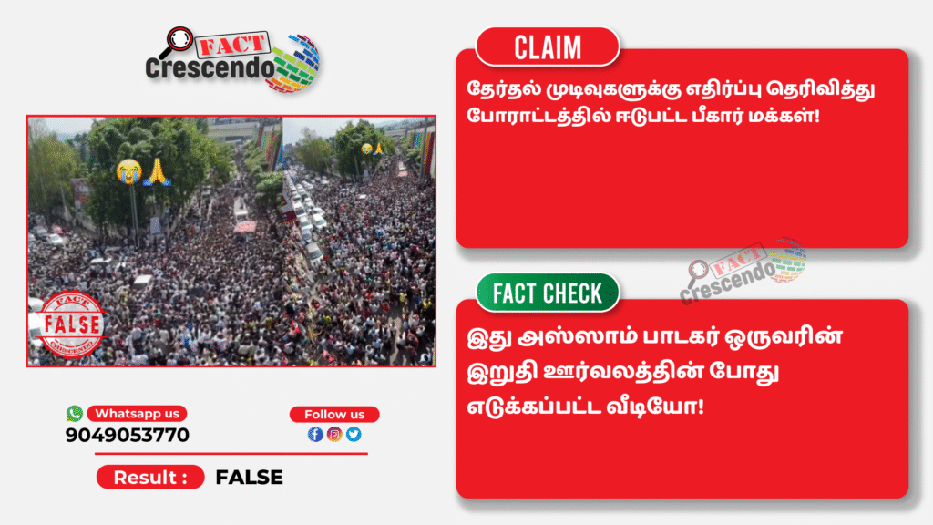 அஸ்ஸாம் பாடகர் ஒருவரின் இறுதி ஊர்வலத்தின் வீடியோவை எடுத்து தேர்தல் முடிவுகளுக்கு எதிராக போராட்டத்தில் ஈடுபட்டு வரும் பீகார் மக்கள் என்று தவறான தகவல் சேர்த்து சமூக ஊடகங்களில் பகிர்ந்திருப்பதை தகுந்த ஆதாரங்கள் அடிப்படையில் ஃபேக்ட் கிரஸண்டோ தமிழ் உறுதி செய்துள்ளது. எனவே, நமது வாசகர்கள், இத்தகைய தவறான செய்தி, புகைப்படங்கள், வீடியோ போன்றவற்றை உறுதி செய்யாமல் மற்றவர்களுக்குப் பகிர வேண்டாம் என கேட்டுக் கொள்கிறோம். வாசகர்கள் தங்களுக்கு சந்தேகம் என்று தோன்றும் தகவல், பதிவு, புகைப்படம், வீடியோவை எங்களது வாட்ஸ் ஆப் எண்ணிற்கு (+91 9049053770) அனுப்பினால், அதுபற்றி ஆய்வு செய்து உண்மை விவரத்தை வெளியிடுகிறோம்.